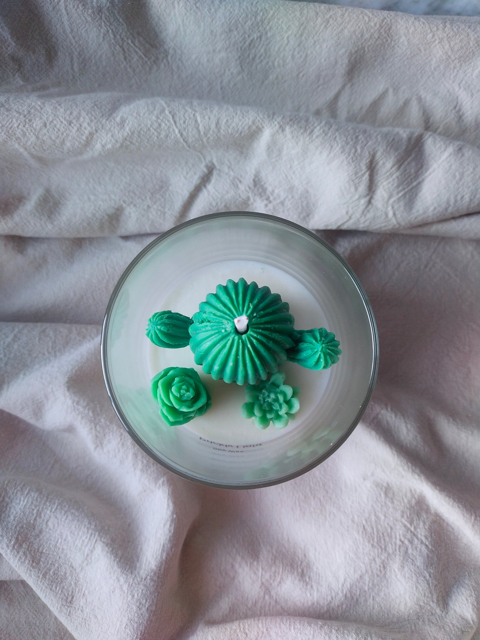 Unique cactus design set inside a clear glass vessel — decorative even before you light it.